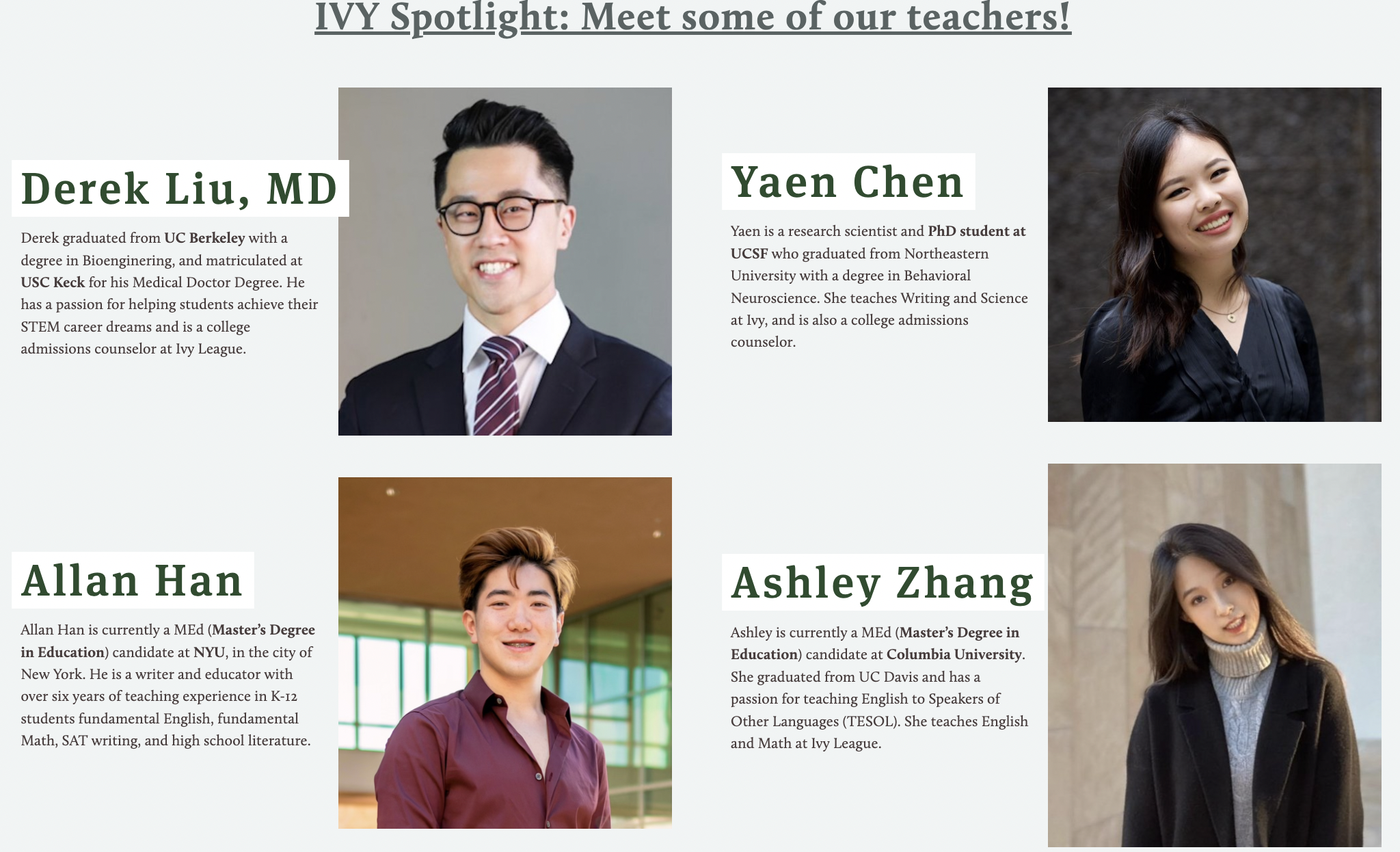 With a schooling system and curriculums designed by Columbia and Stanford University alumni, Ivy Education uses a unique blend of progressive and traditional approaches to learning. Each of our teachers are professionally trained educators with formal teaching experience. Most importantly, we’re passionate about what we do! We engage our students through learning games, rewards systems, effort-based praise, and intrinsic motivators. Thats why many of our students stay with us for their entire K-12th grade learning journey.